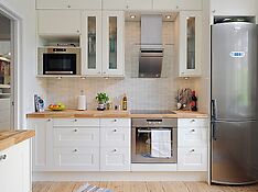 Такой вариант установки холодильника подойдет для небольшой семьи. Компактная модель полностью удовлетворит потребности 2-х человек. Это одноярусный холодильник, который идеально впишется в нижний ряд кухонного гарнитура.