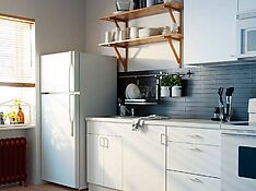 Габаритная техника может стоять вплотную к стене или возле окна. Во втором варианте важно, чтобы холодильник не перекрывал оконный проем, так как прямые солнечные лучи нарушат температурный режим, что негативно скажется на работе техники, приведет к ее быстрому износу.