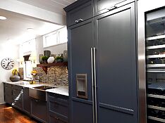 А если кухня просторная, на ней с легкостью можно разместить даже два холодильника. Один будет использоваться как основной, другой, расположенный под островным гарнитуром, – служить для овощей или эксплуатироваться в качестве мини-бара.