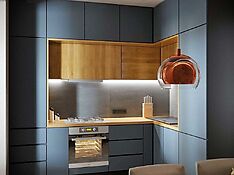 Альтернатива – дверки, поднимающиеся вверх. Да, они чуть дороже за счет наличия механизмов поддержки – микролифтов, но удобство того стоит. Газлифты фиксируют дверки в открытом положении, а также обеспечивают плавное закрытие без «хлопков». Обычно такое решение используется для горизонтально расположенных шкафчиков.