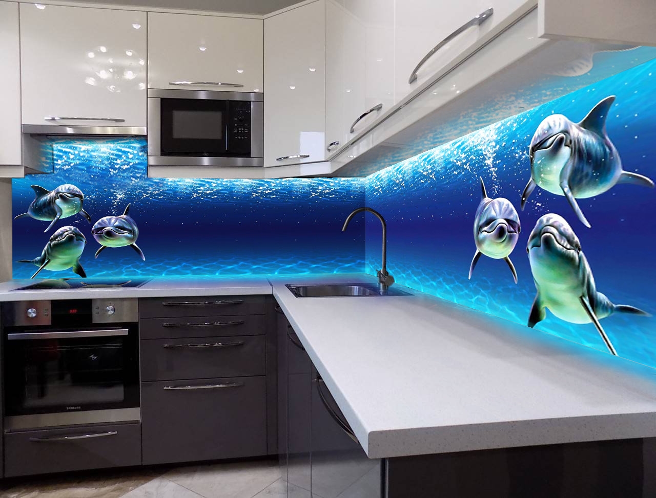 - в качестве фартука для стены лучше выбрать скинали, если вы всё же выбрали плитку, не используйте для межплиточных зазоров затирку белого цвета;