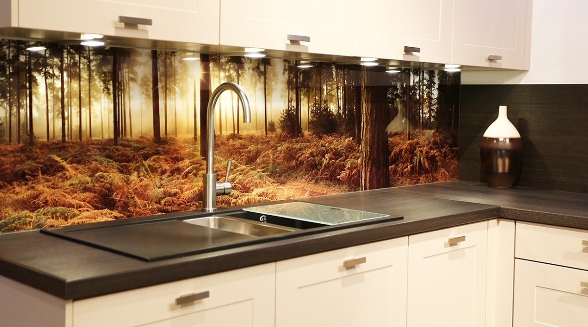 Скинали — это декоративные панели из стекла, закрывающие часть стены между нижним и верхним рядами шкафов. Основой для скинали служит ударопрочное закалённое стекло. На обратной стороне стекла, обращённой к стене, наносится узор, рисунок или изображение с помощью фотопечати. Установка скинали и их очистка в процессе эксплуатации производится быстрее керамической плитки, обычно используемой в этой части кухни. Но главное преимущество скинали — декоративный эффект, создаваемый панорамным фотографическим изображением. На фото ниже — вариант исполнения скинали в сочетании с модульной кухней Глетчер, представленной в интернет магазине мебельной компании «АНТАРЕС».
