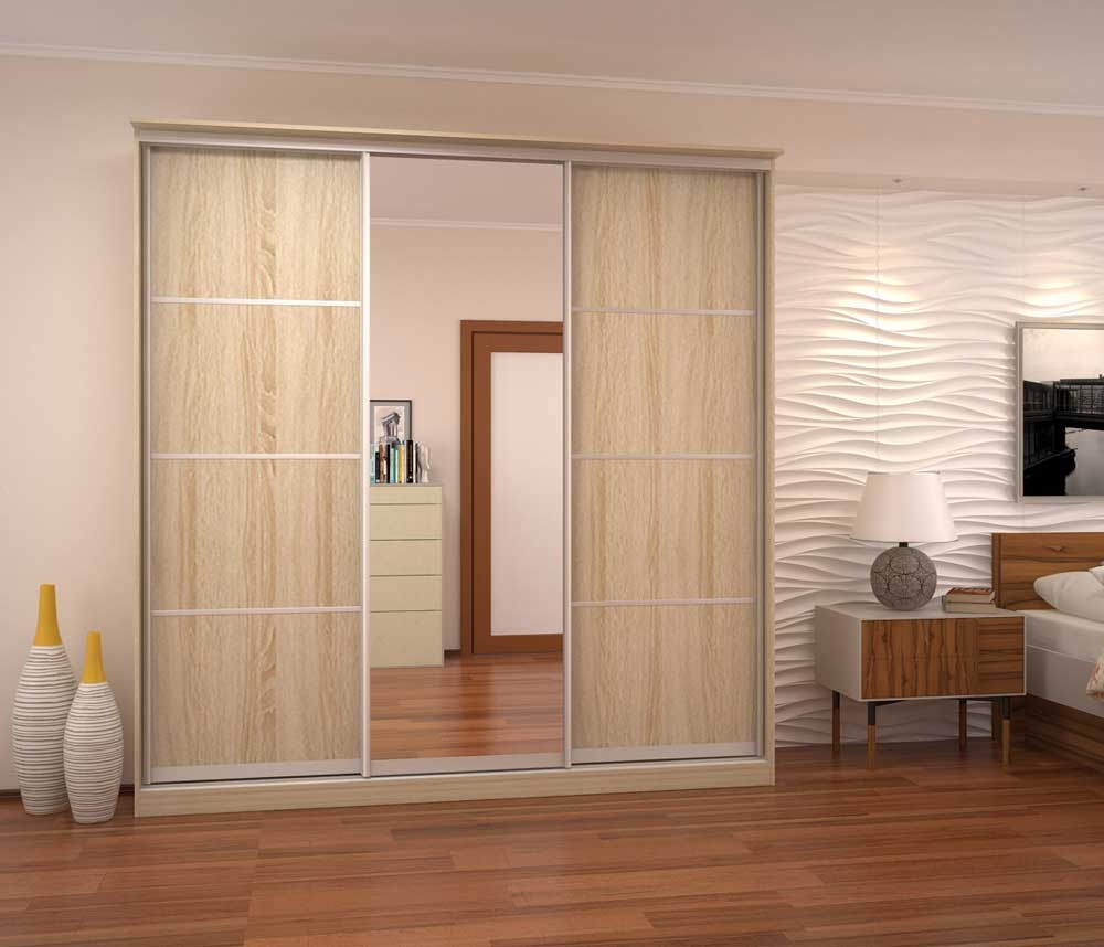 Вне зависимости от высоты шкафа, сами двери не делают выше 2,6 – 2,65 м. Если шкаф выше раздвижных дверей, оставшееся пространство закрывается фальшпанелями или там оборудуются отдельные дверцы. Что касается глубины шкафов, стандартным считается размер 0,6 метра. При такой глубине удобно пользоваться полками для одежды и штангами для вешалок. Длина шкафа выбирается исходя из размеров помещения и потребности в системах хранения. Обычно направляющие для шкафов – купе имеют длину до 6 метров, но при этом могут состоять из нескольких элементов, так как не во всякую квартиру можно занести такие длинные детали.