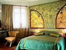 «Арт-деко», казалось бы, не предполагает использование зелёных оттенков при оформлении спальни. Но это является ошибочным мнением. Именно на интенсивном зелёном фоне располагается «визитка» стиля – Sunburst, зеркало с диагонально расходящимися солнечными лучами. Это символ жизни, тепла, развития и позитива.