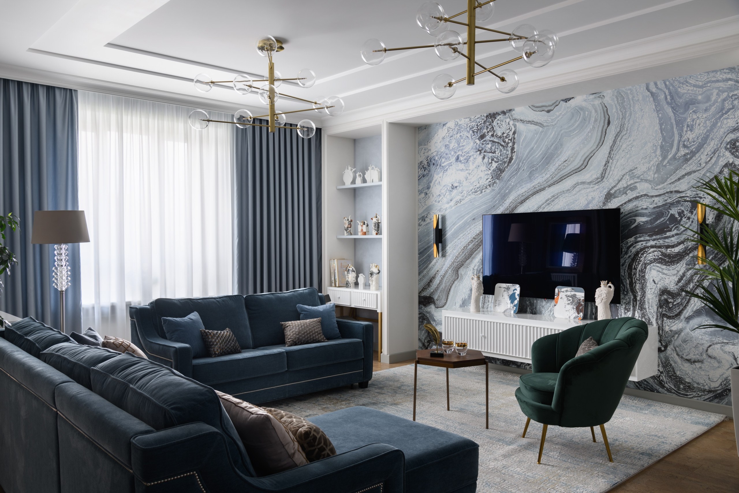 В 2024 году классические отделочные материалы снова «на гребне волны». Натуральный керамогранит или же натуральный мрамор – прекрасный вариант для создания красивого интерьера. Его можно встретить везде: в арт-деко, в современном и скандинавском стилях, в минимализме. Главное правило – необходимо использовать именно крупноформатный материал с детализированным принтом, нейтральными или холодными оттенками.