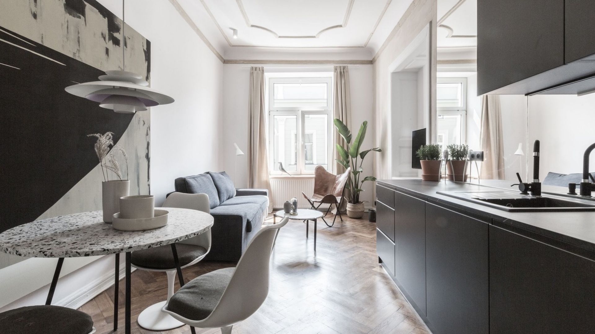 Ещё один тренд 2024 года, заслуживающий внимания, это французский фьюжн. Он представляет собой сочетание роскошной мебели, молдингов, декоративного текстиля. Его всегда дополняют элементы современного искусства и натуральный паркет. Парижский стиль в квартире – это изобилие антиквариата, роскошная библиотека с сотнями книг, легкий беспорядок в комнате и на кухне. Особенно выигрышно французский фьюжн выглядит в квартирах домов старой постройки, имеющих высокие потолки и габаритные окна.