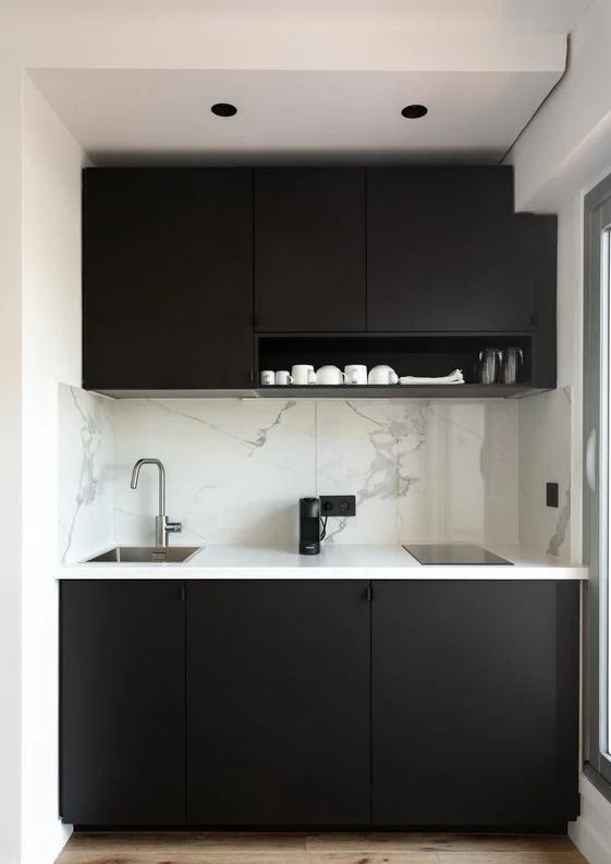 Даже в компактное помещение можно удачно вписать черный кухонный гарнитур. Придерживайтесь следующих советов: