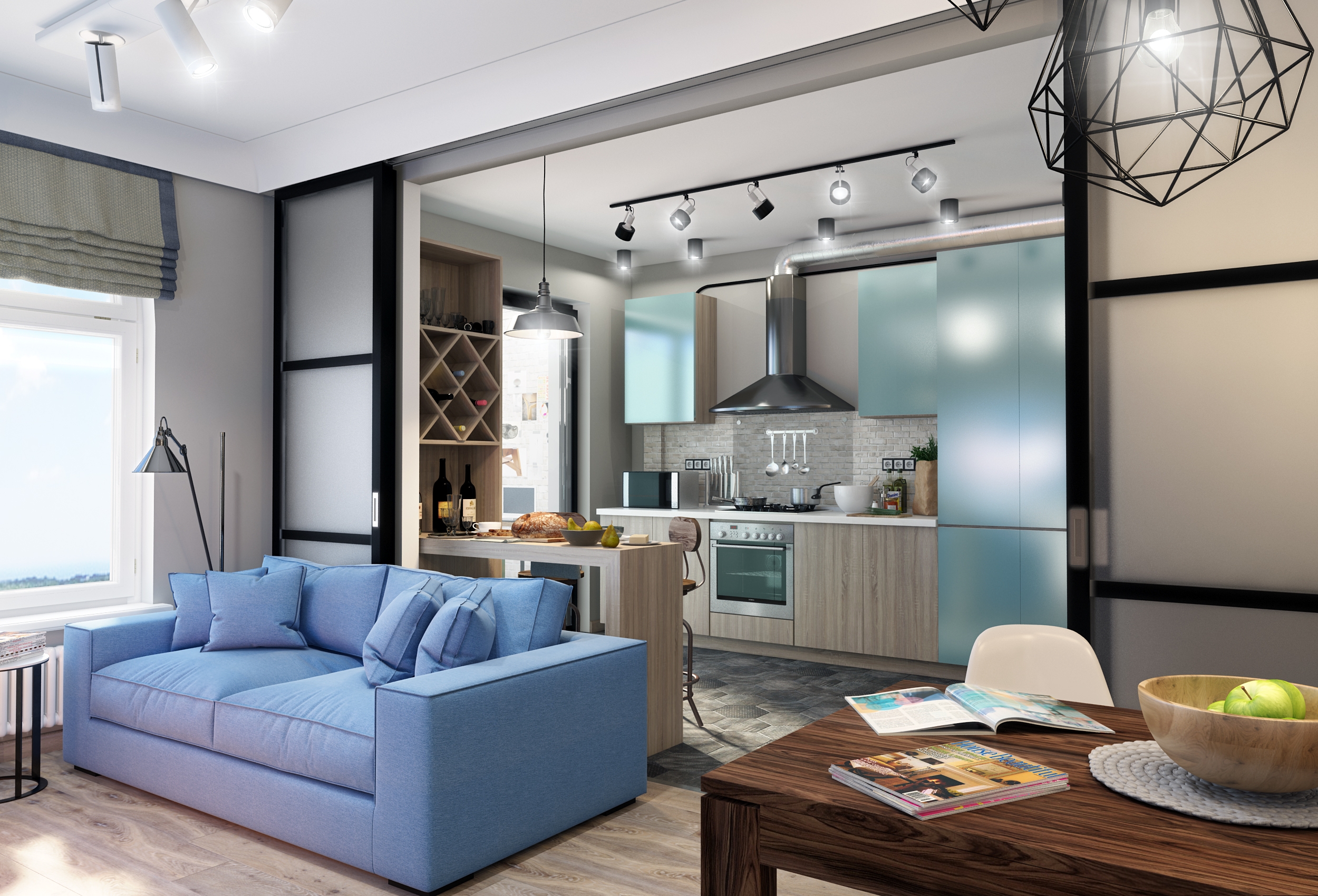 Совмещённая кухня – это прилив солнечного света. Дневной свет, играя на фасадах, делает помещение ярче и, следовательно, визуально просторнее.