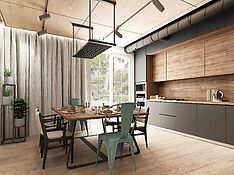 Если кухня имеет высокий потолок, его можно украсить лёгкими деревянными балками, внутри которых будут уложены коммуникации. Этот элемент присущ стилю лофт, но, как говорилось выше, эко базируется на современных направлениях и от каждого берёт определённые штрихи.