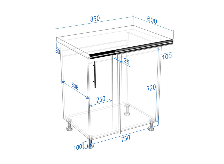 Размеры рабочих столов указанны по столешнице, фактические размеры предметов изготавливаются меньше для сантехнических нужд. Смотреть схематические изображения ниже.